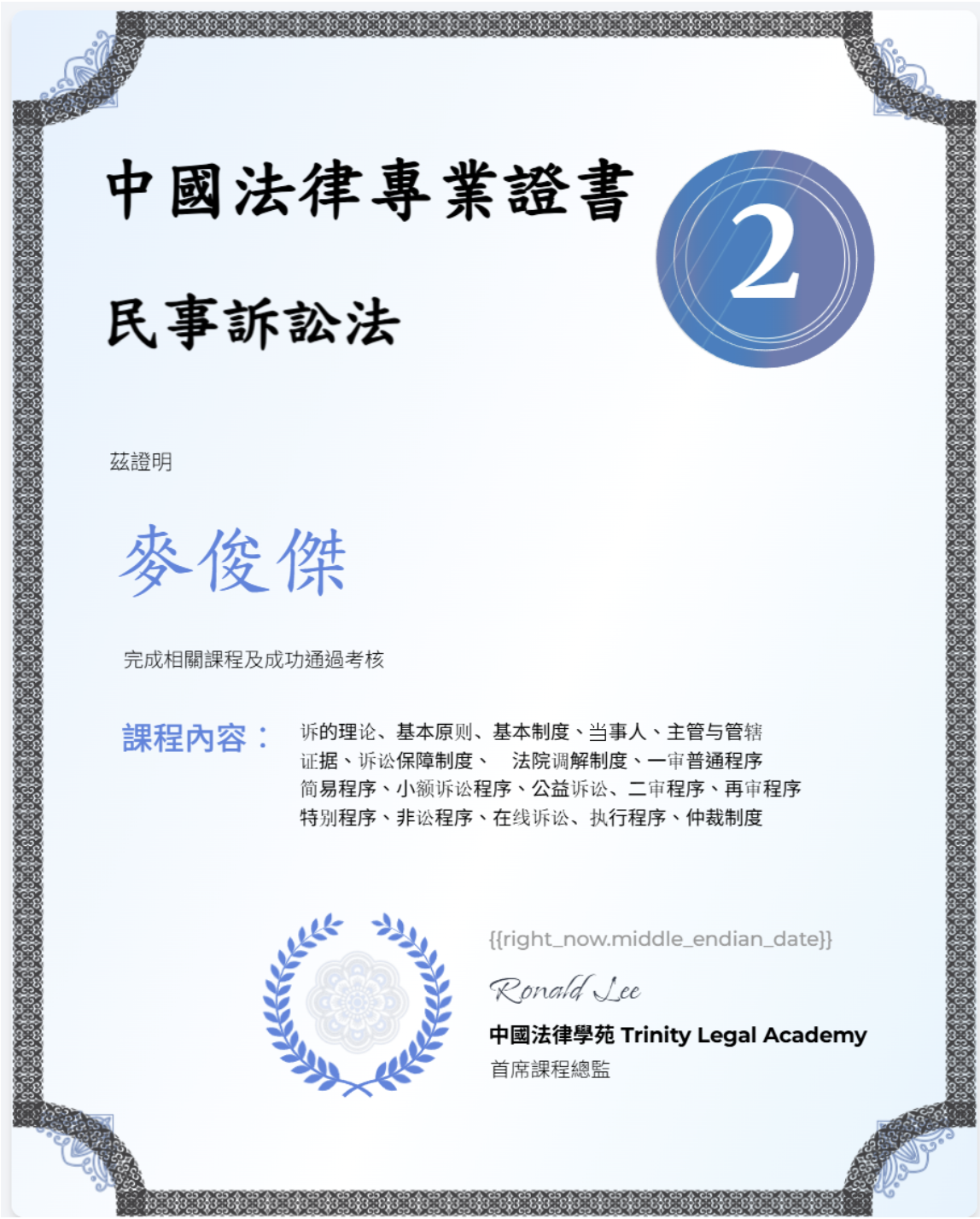 課程共分八個單元,每完成一個單元(須完成教學影片及課後練習),即可獲頒該單元證書。集齊全數八張單元證書,即可換領實體中國法律課程總證書,並憑此免費報讀本中心舉辦的實體操題班。