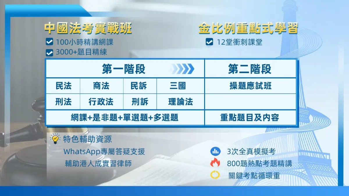 八個主題科目包括民法、刑法、民事訴訟法、刑事訴訟法、商經法、行政法、理論法及三國法,每科均配備清晰易明的PPT簡報,以及專為香港考生編寫的《詳細考點精粹筆記》,化繁為簡、重點歸納。
