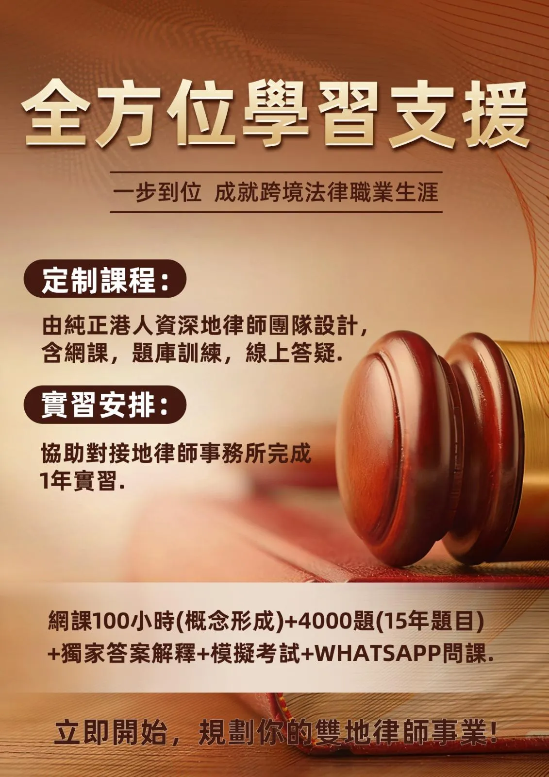 不僅是補習,更包辦實習。我們與廣東格祥律師事務所合作,為通過考試的學員提供內地實習名額、一對一指導及各類法律諮詢會籍支援。