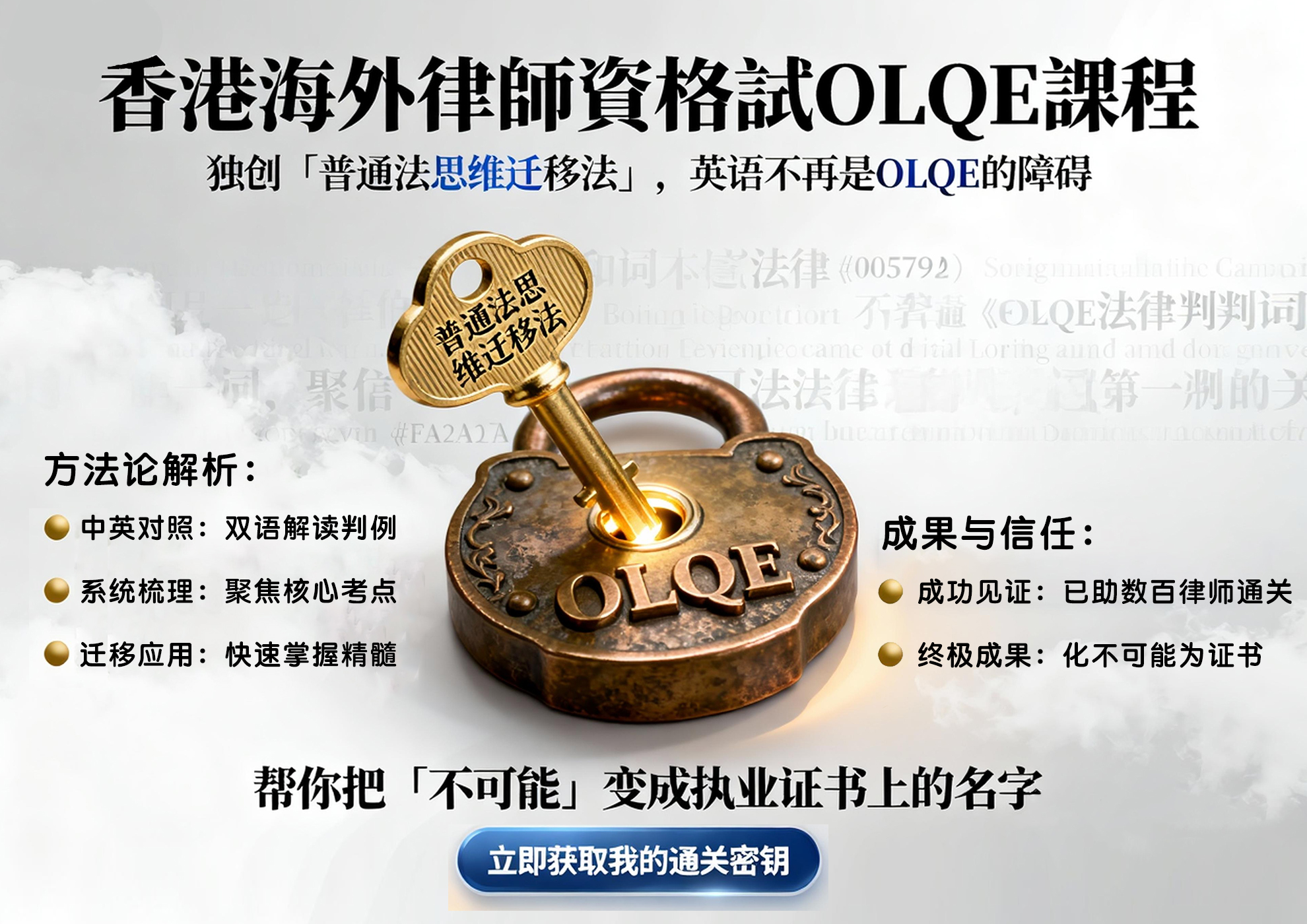 挑戰與機遇並存。我們的課程包含「法律英語特訓」,專攻 Tort, Fiduciary Duty 等核心術語。數據顯示,76% 英語基礎薄弱學員經特訓後成功通關。我們還提供免費的「OLQE 英語能力評估」,助您精準定位。